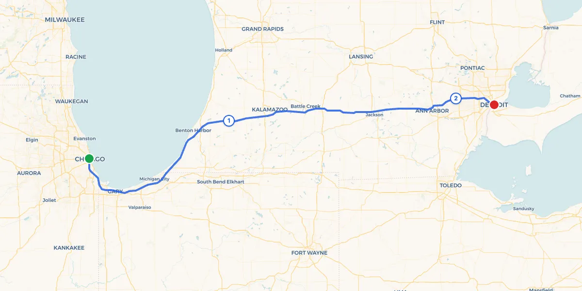 The 283-mile drive from Chicago to Detroit follows I-90 east through northwest Indiana, then picks up I-94 across southern Michigan. At around four and a half hours of driving, two stops keep the trip manageable for families. SmartStops found Tiger Den Sports Complex in Lawrence, Michigan for your first break, with a second stop in Plymouth near Detroit where you can choose from dozens of parks, restaurants, and coffee shops before the final stretch into the city.