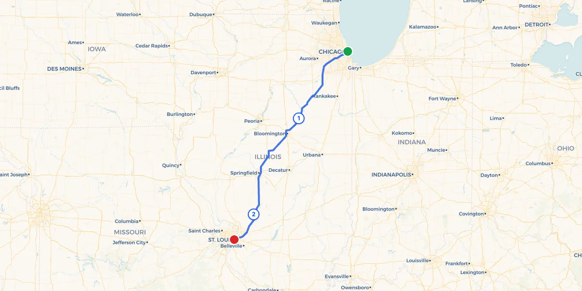 The 297-mile drive from Chicago to St. Louis follows I-55 south through the heart of Illinois, passing Bloomington-Normal, Springfield, and the old Route 66 corridor. At nearly five hours, two stops keep the trip comfortable for families. SmartStops found Keller Park in Chenoa, Illinois for your first break, and a second stop near Mount Olive where you can choose from local parks and restaurants before crossing into the St. Louis metro area.