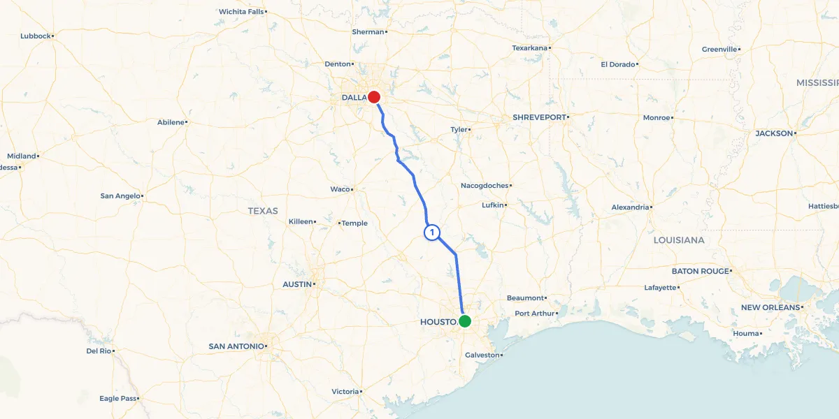 The 239-mile drive from Houston to Dallas follows I-45 straight north through the East Texas piney woods and rolling farmland. Without stops, you are looking at about 3 hours and 42 minutes of drive time. SmartStops places a family break in Madisonville, roughly 90 minutes up the highway, where kids can stretch their legs at Lake Madison Park before the final push into the Dallas-Fort Worth metroplex.