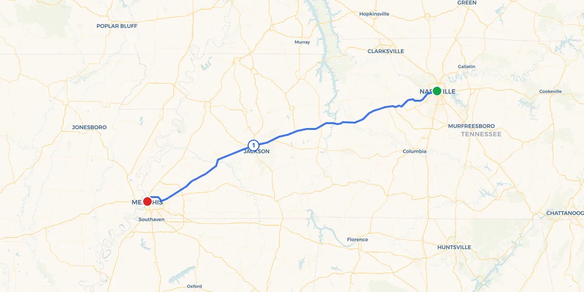 The 212-mile drive from Nashville to Memphis follows I-40 West across the width of Tennessee, moving from the rolling Cumberland Plateau through the flat farmland of West Tennessee. Without stops, the trip takes about 3 hours and 20 minutes. SmartStops places your family break in Jackson, TN, roughly two hours west of Nashville, where Conger Park on North Highland Avenue has a playground and tennis courts to help kids burn off backseat energy.