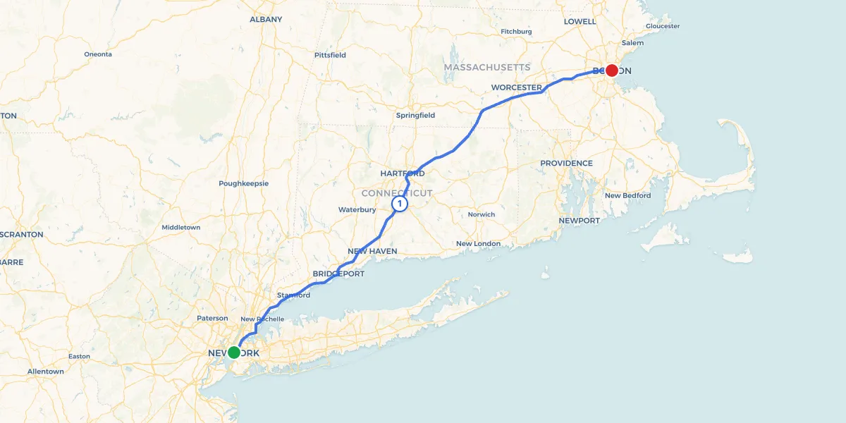 The total distance is 215 miles, with a driving time of about four hours without stops. Adding a 20-minute park break in Middletown brings the total trip time to around four and a half hours. Rush hour traffic through southwestern Connecticut or around the I-90 interchange near Boston can add another 30 to 45 minutes.