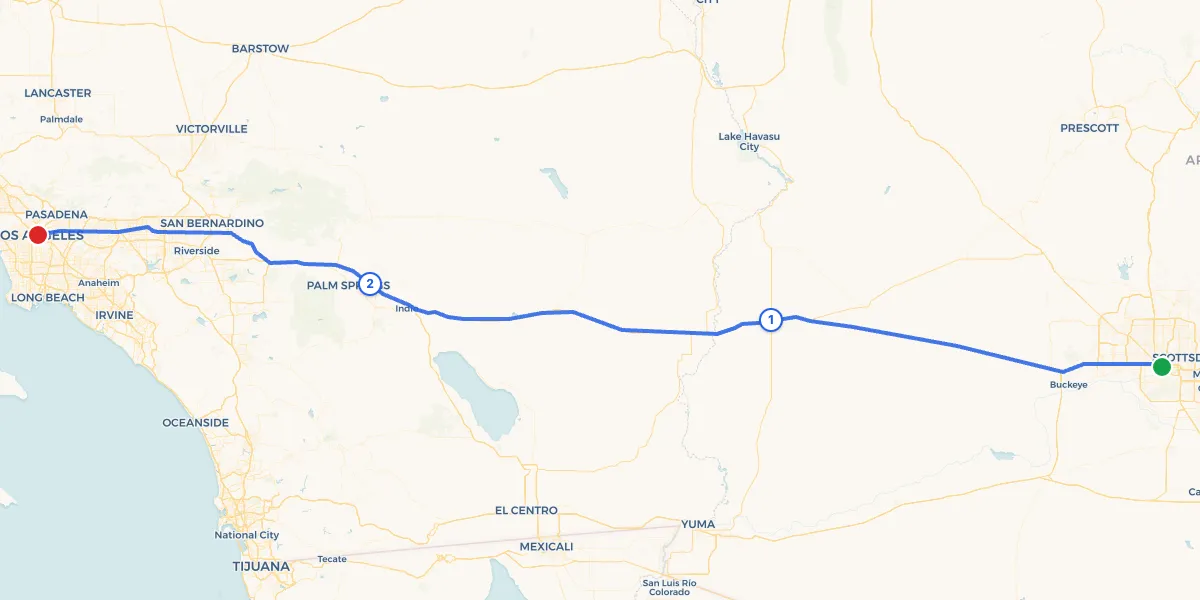 The 372-mile drive from Phoenix to Los Angeles on I-10 takes about six hours through the Arizona desert, across the Colorado River, and into Southern California via the Coachella Valley. SmartStops plans two stops to break up the drive. Your first break at Quartzsite, Arizona, features a town park with a playground, basketball courts, skatepark, and baseball field. The second stop at Cathedral City near Palm Springs offers 49 parks and 25 restaurants, making it an ideal longer break before the final stretch into LA.