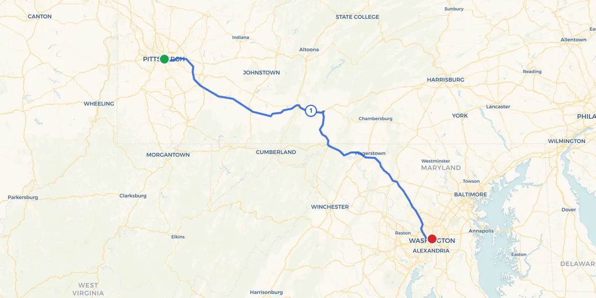 The 242-mile drive from Pittsburgh to Washington DC crosses the Allegheny Mountains on the Pennsylvania Turnpike (I-76) before joining I-70 into Maryland and I-270 south toward the Capital Beltway. The mountain terrain and winding grades make this drive feel longer than the four-hour estimate suggests. A stop in Everett, Pennsylvania lets kids burn energy at Snake Spring Community Park while you refuel and grab a bite near the turnpike.