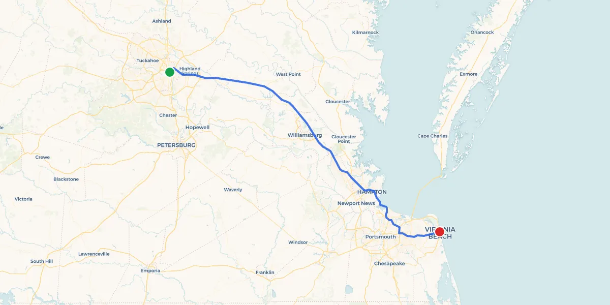 The 107-mile drive from Richmond to Virginia Beach follows I-64 east through Williamsburg and across the Hampton Roads area. At under two hours, this is one of the shortest family routes in our collection, and most families can make it without a formal stop. Still, SmartStops can help you scout parks and playgrounds near the route if you want to break the drive up, especially with toddlers or if you are combining this trip with a visit to Colonial Williamsburg.