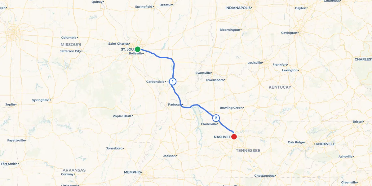 The 308-mile drive from St. Louis to Nashville takes about 4 hours and 50 minutes, crossing the Mississippi River into Illinois before heading south on I-57 and east on I-24 through Kentucky into Tennessee. The route cuts through the Shawnee National Forest region of southern Illinois and the rolling farmland of western Kentucky. Two stops keep the drive manageable for families, with the first break in Marion, IL offering a park loaded with amenities for kids of all ages.